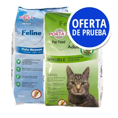 - 1 x 10 kg Porta 21 Feline Finest Sensible sin cereales + 1 x 10 kg Porta 21 Feline Finest Cats Heaven.